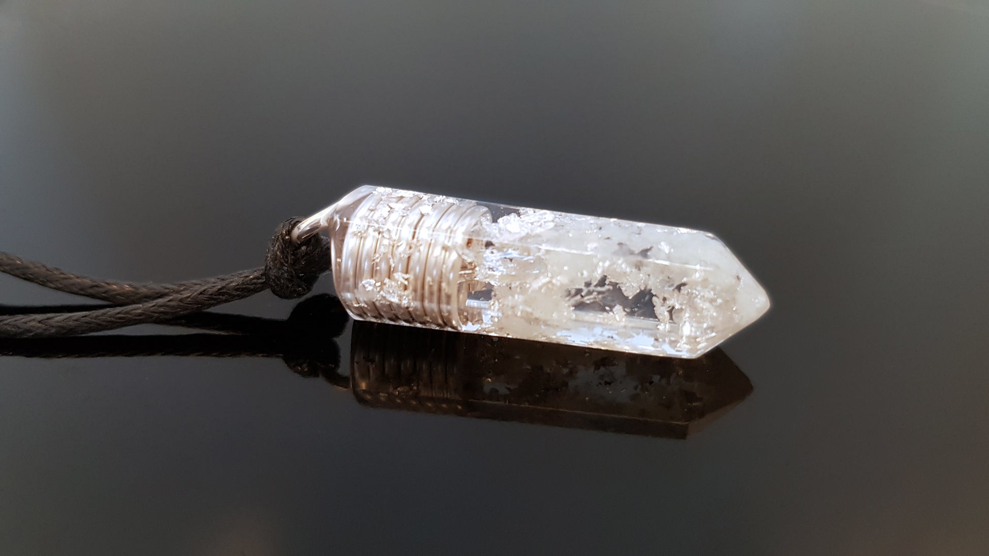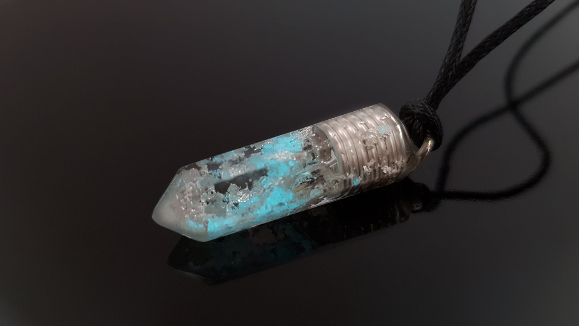 Colgante de orgonita de cristales de alta vibración y efecto brillo en la oscuridad.