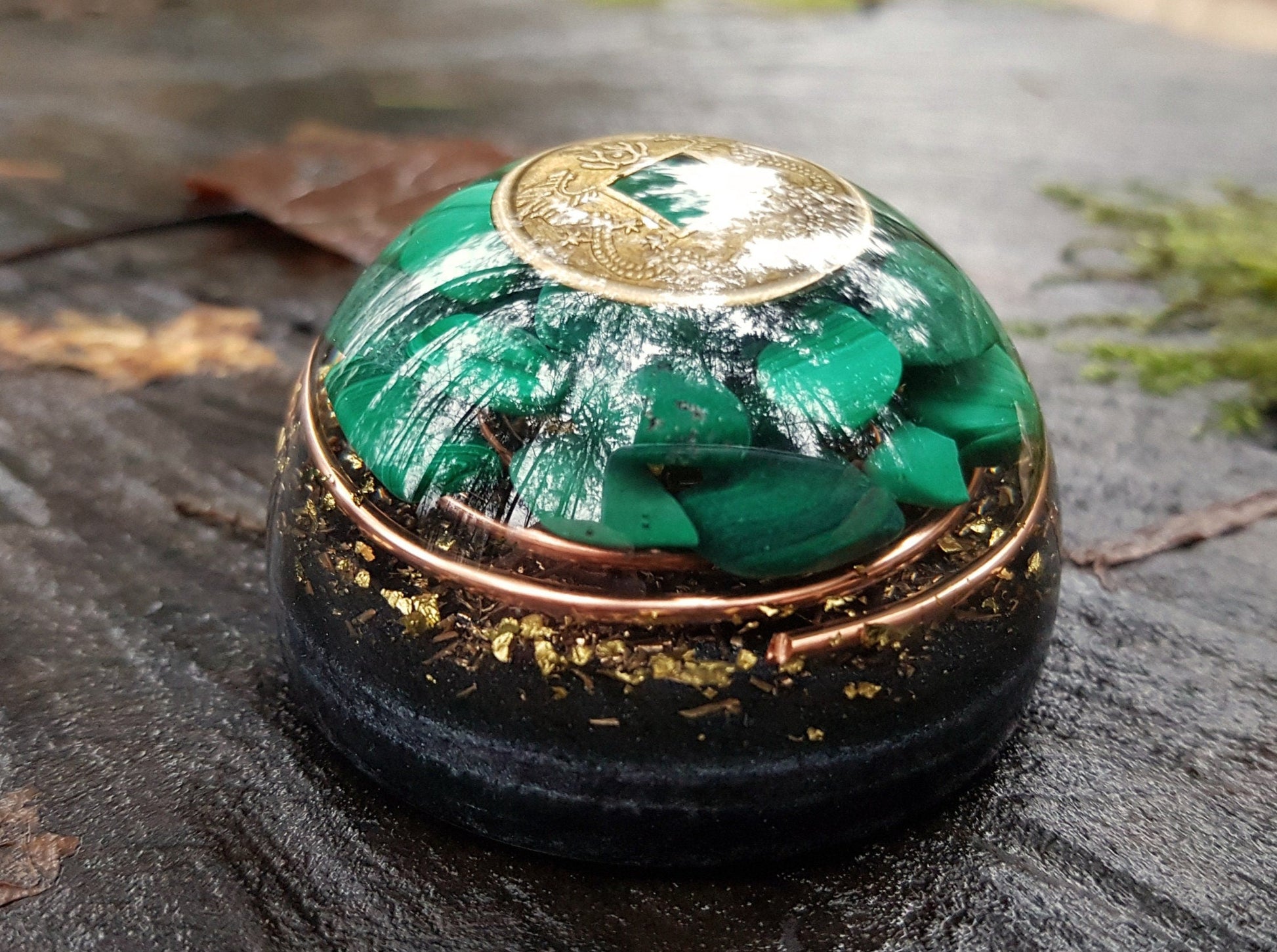 Hemisferio de cúpula de orgonita con malaquita y moneda de riqueza.