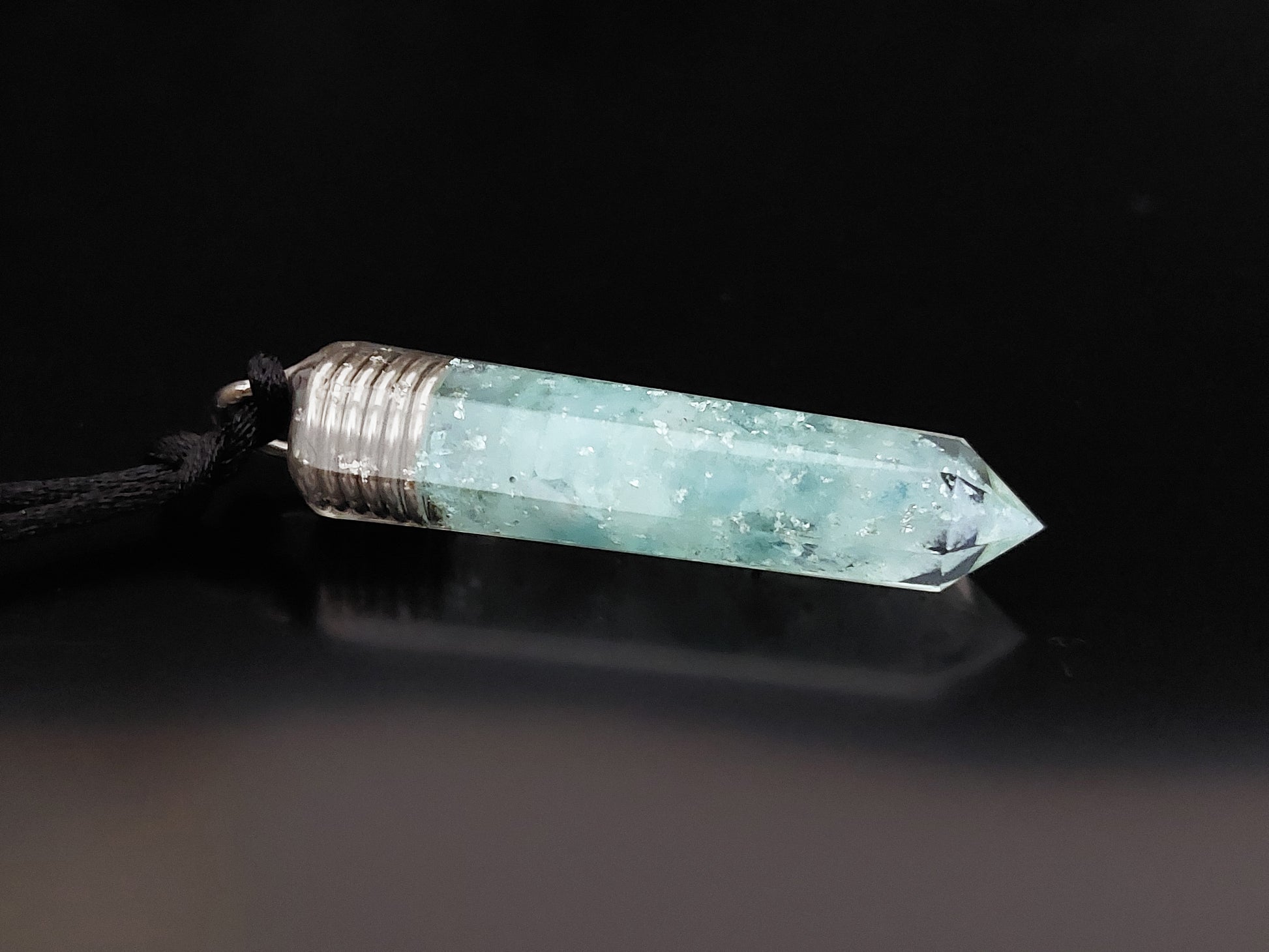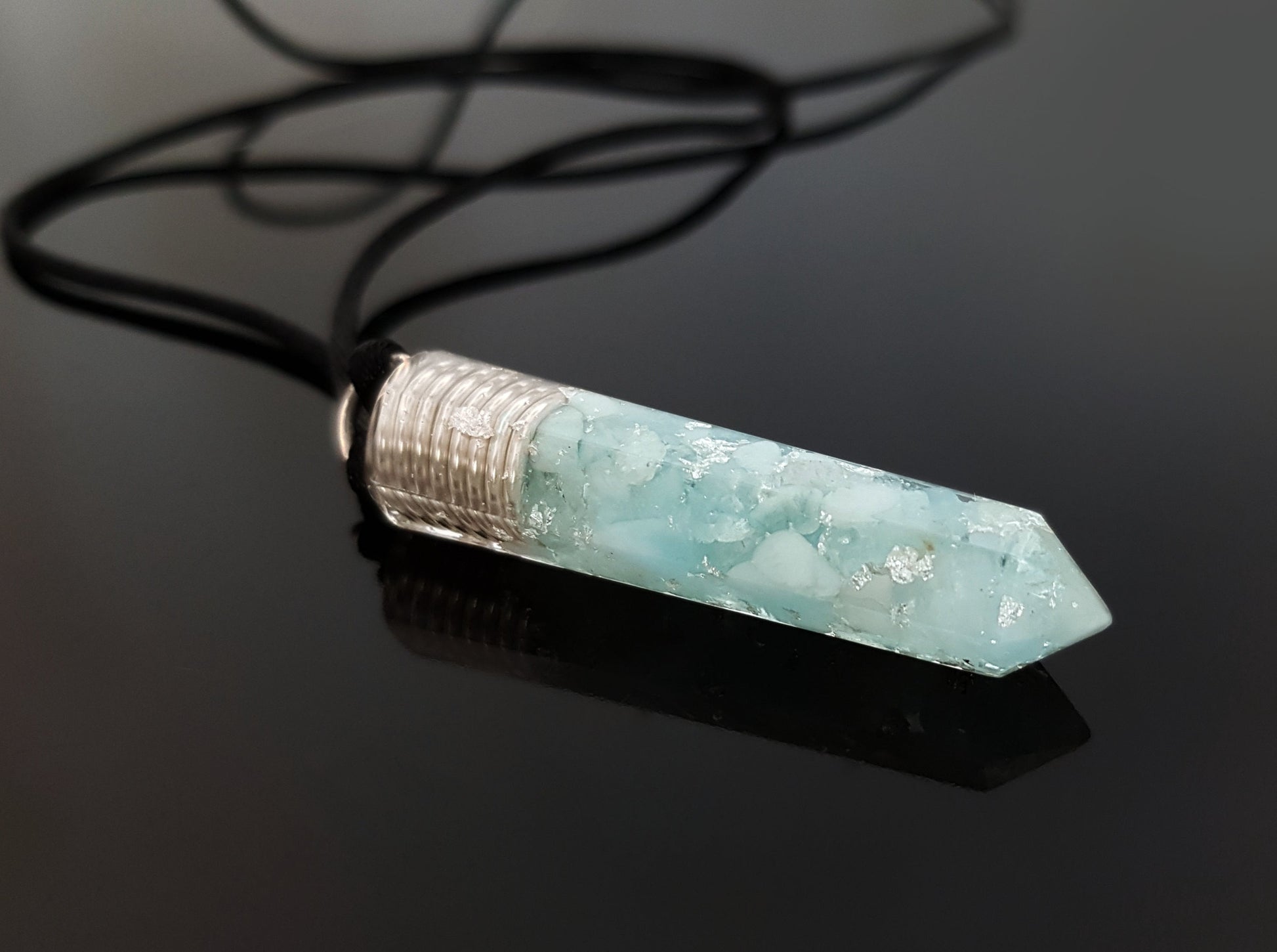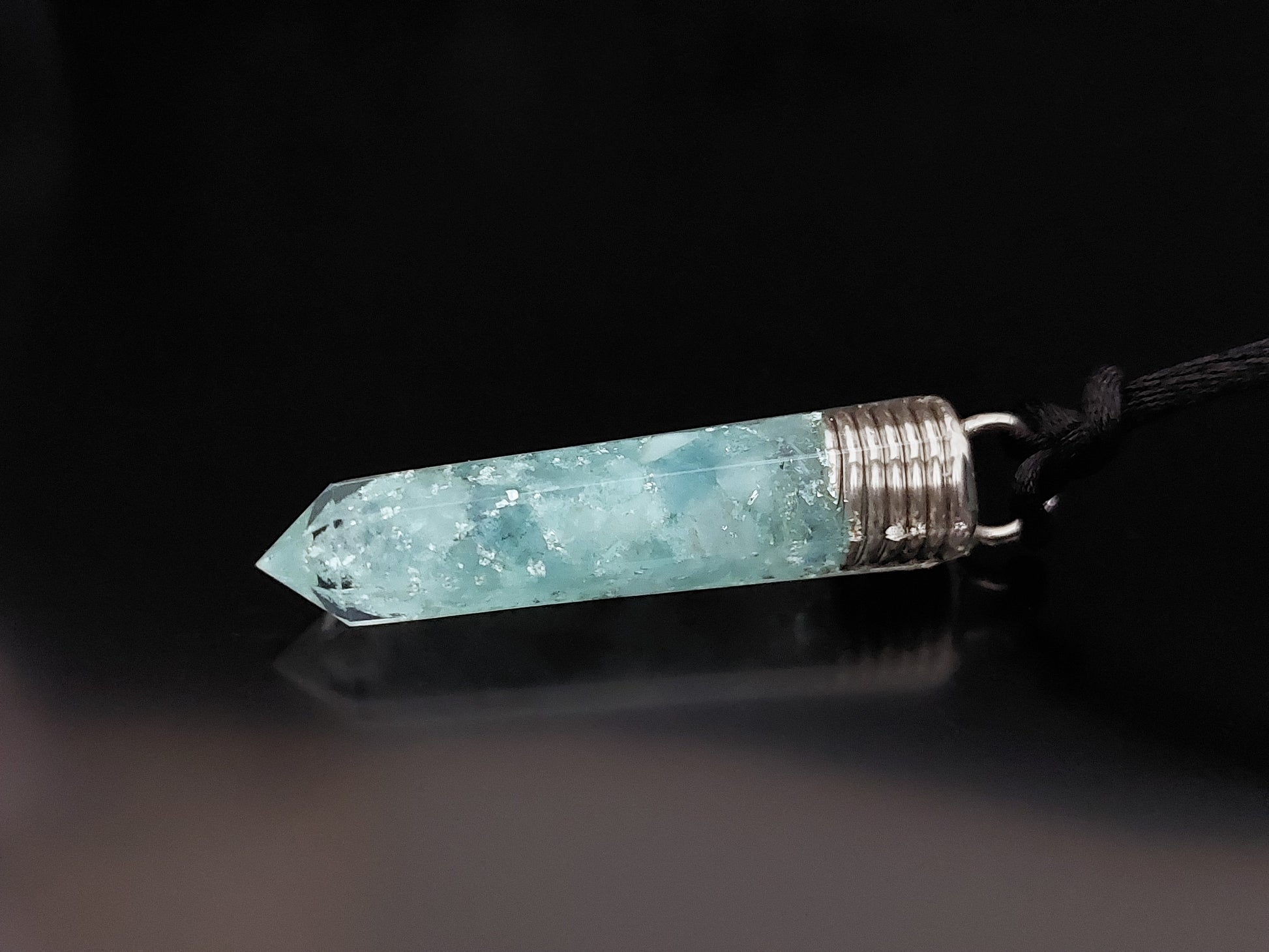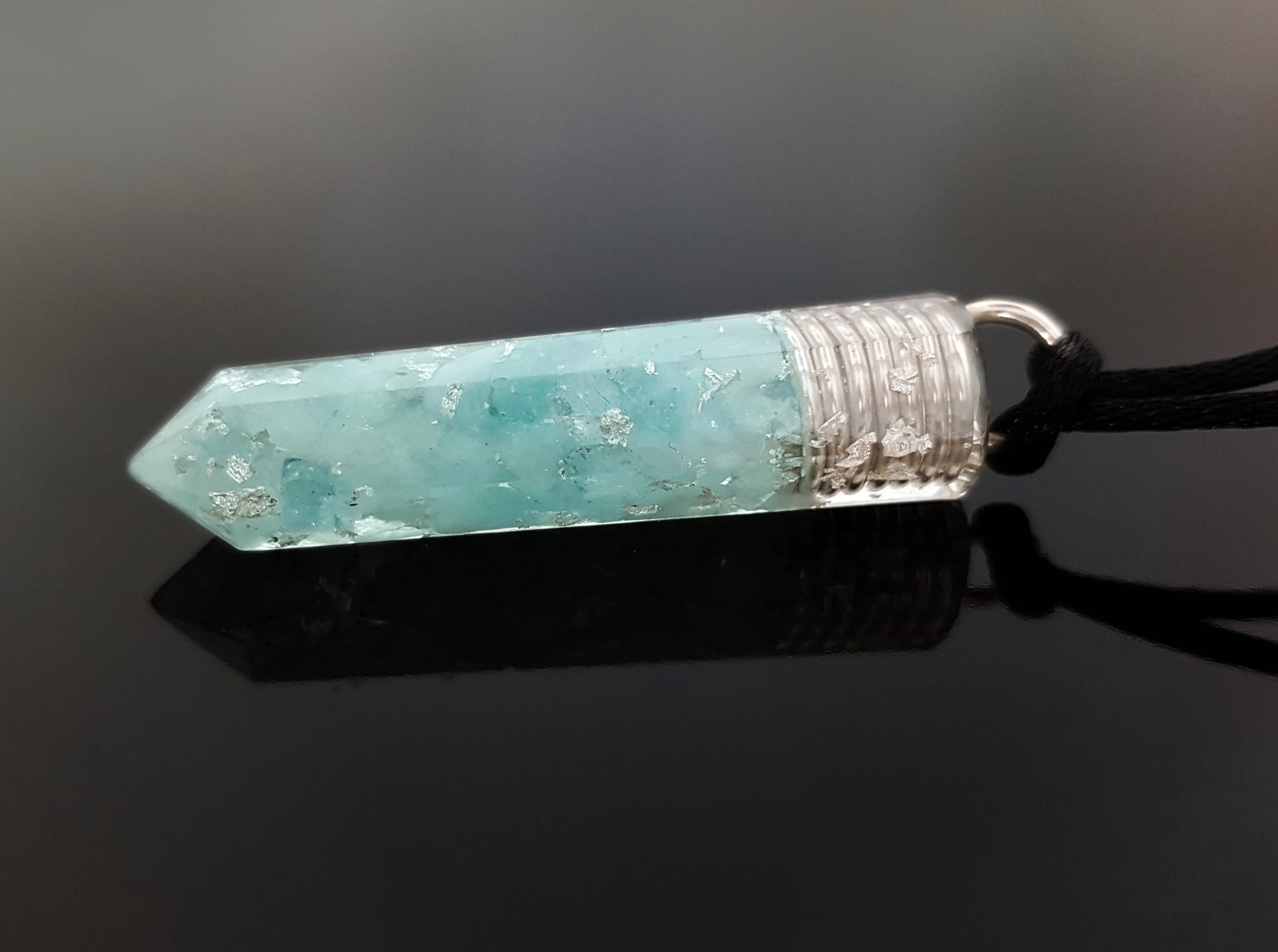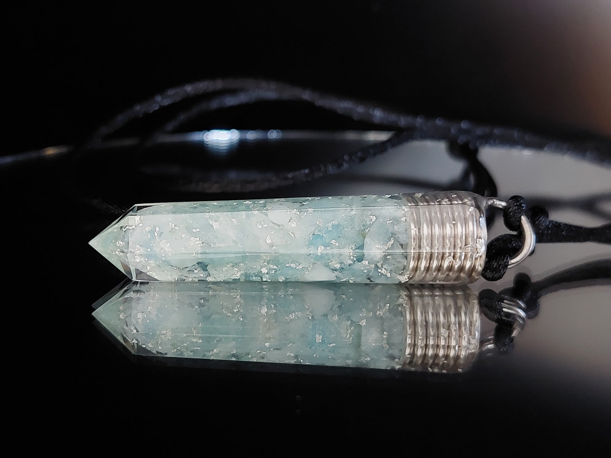 Natural Aquamarine orgonite pendant necklace with silver. Reiki infused crystal chakra healing amulet, glow in dark. Strong and powerful enchanted, programmed amulet / talisman from Reiki, Alchemy and Magic Master. Reiki pendant, chakra healing. This orgone necklace contains very high vibrations, gently and powerfully cleanses the environment of destructive energies, thought forms and influences. Harmonizes the mind, deepens meditation, strengthens the connection with the higher self.