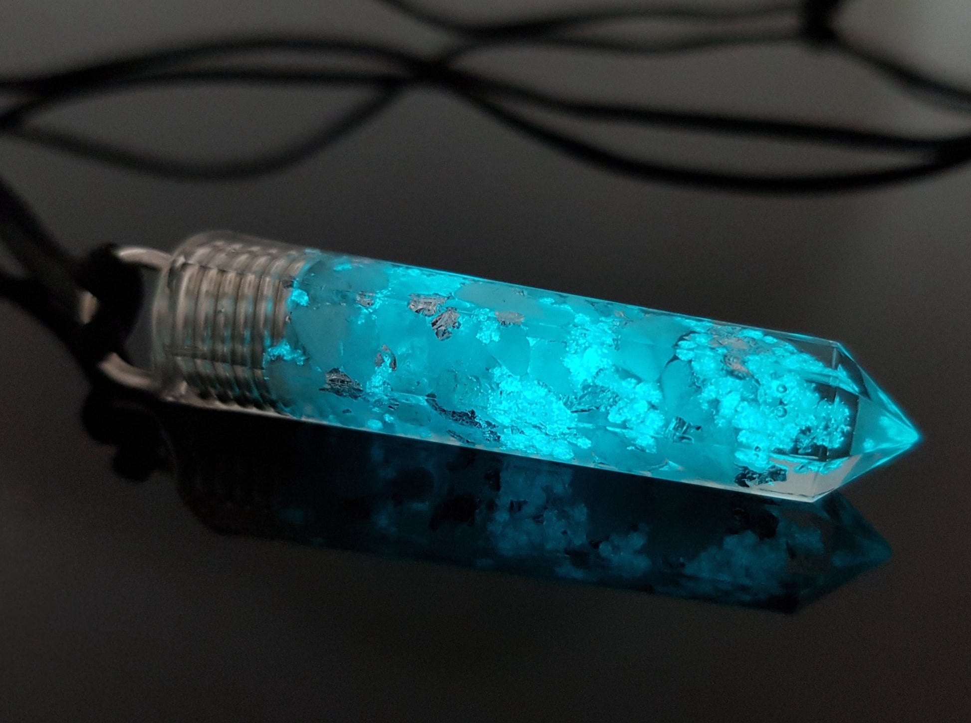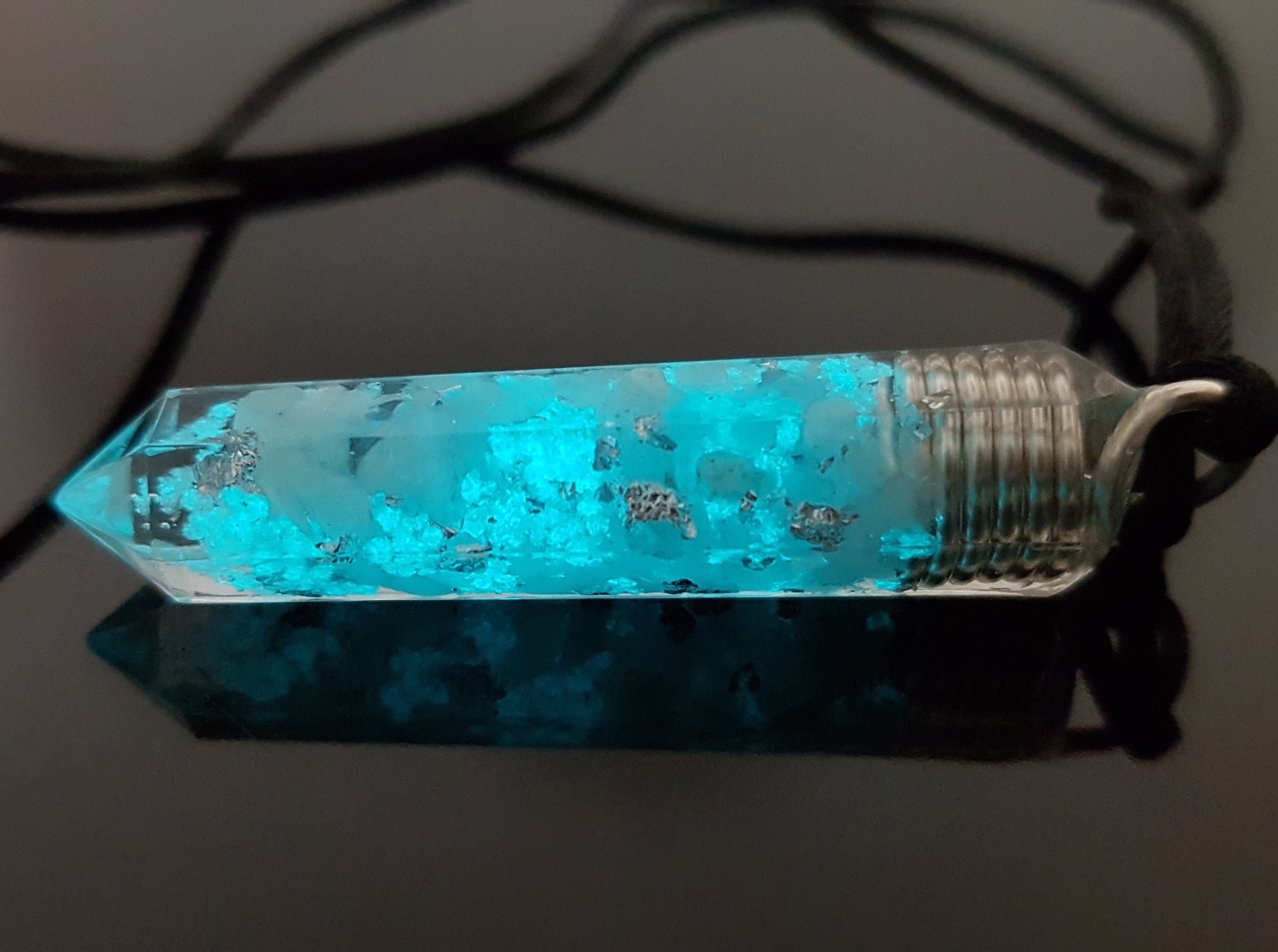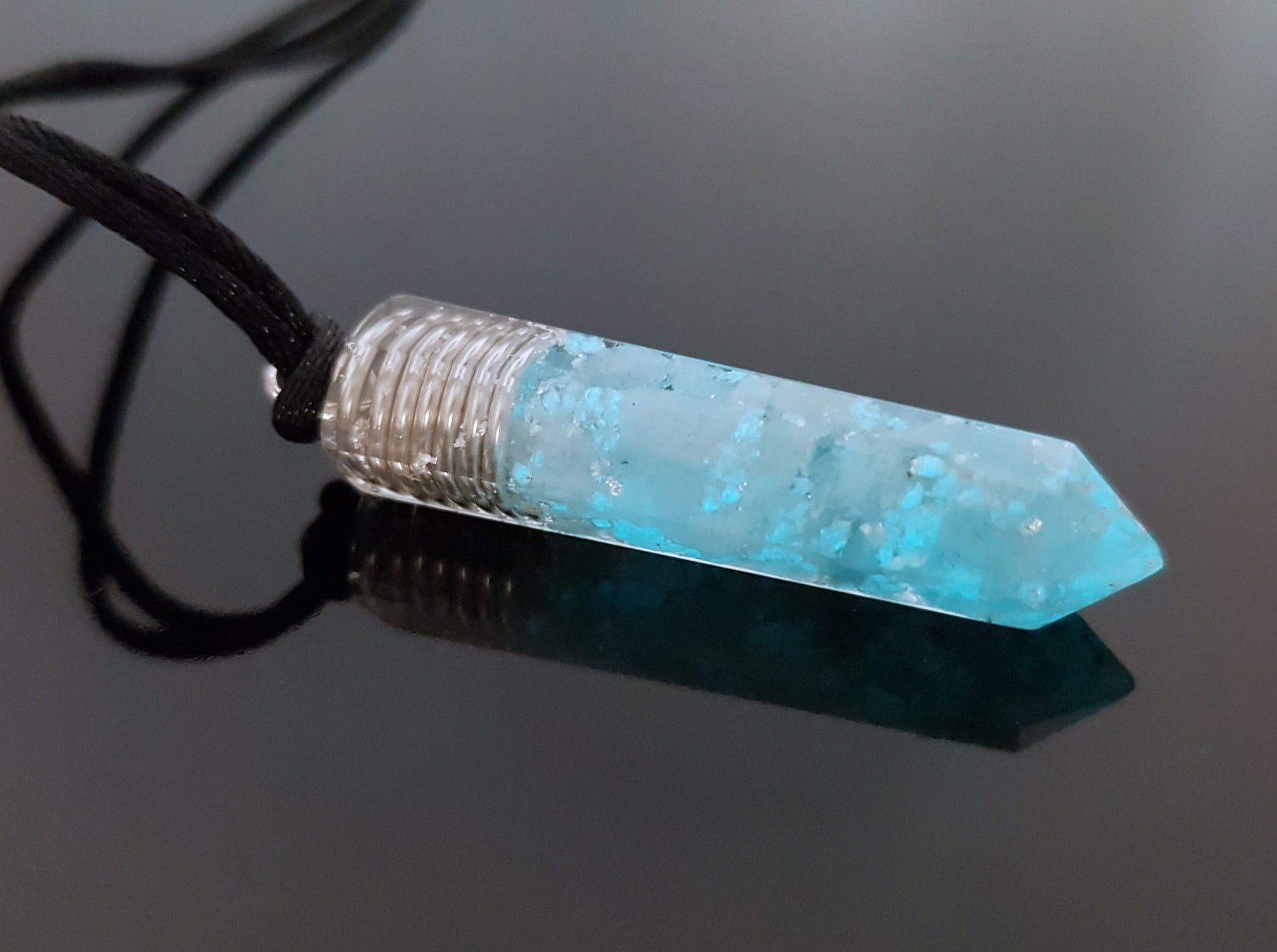 Aquamarine Orgone Orgonite pendant necklace, Reiki infused crystal chakra healing amulet, glow in dark