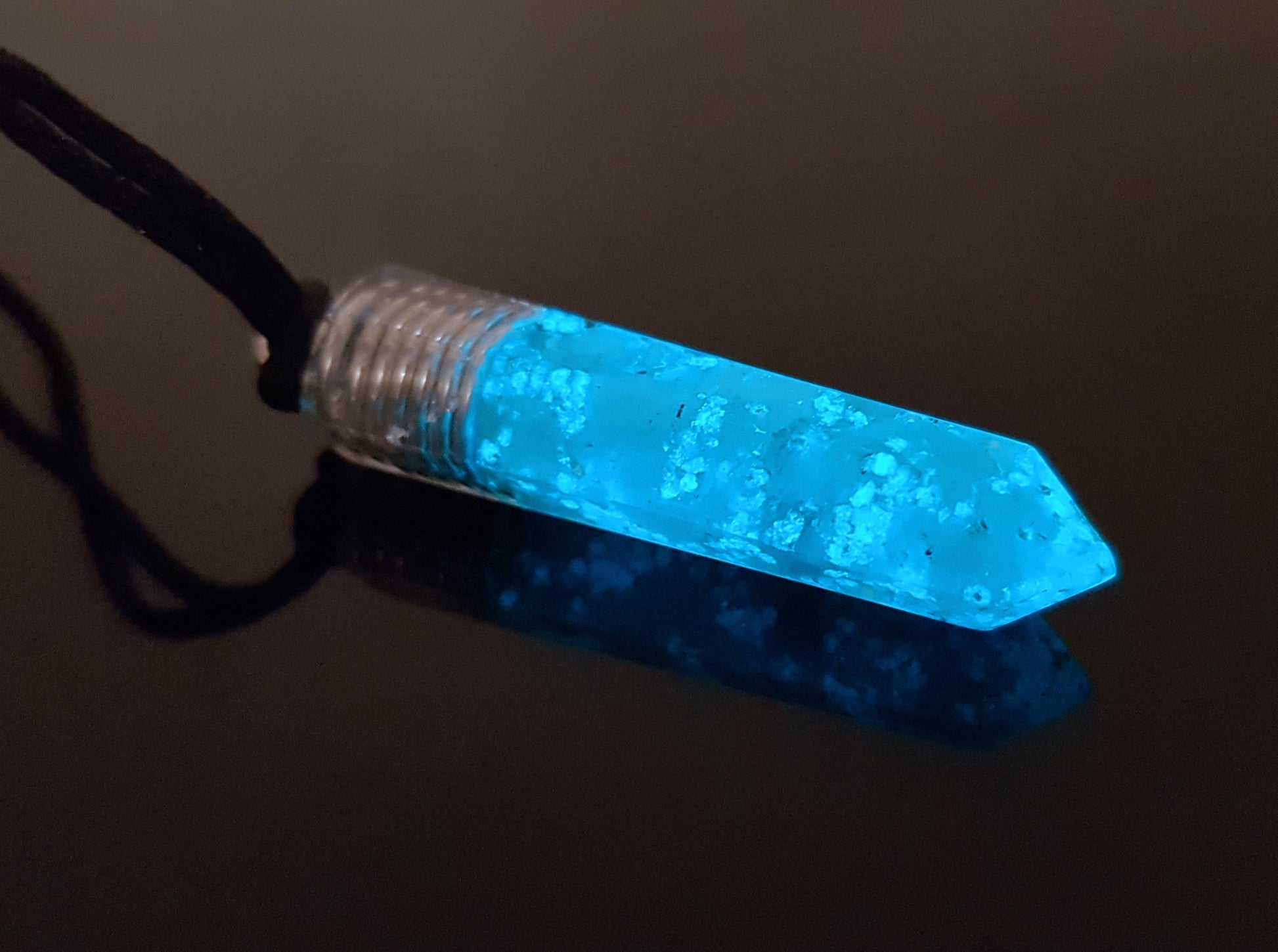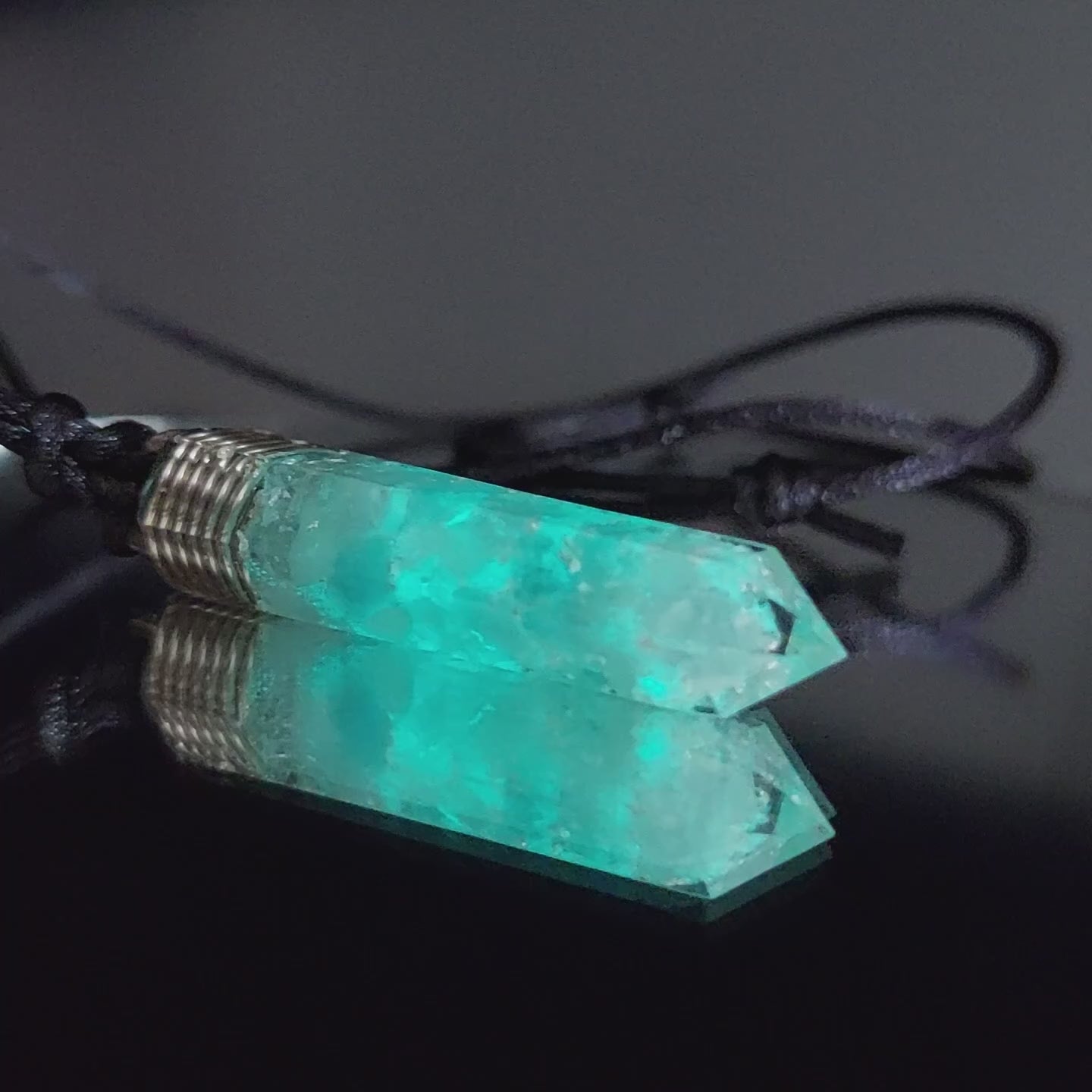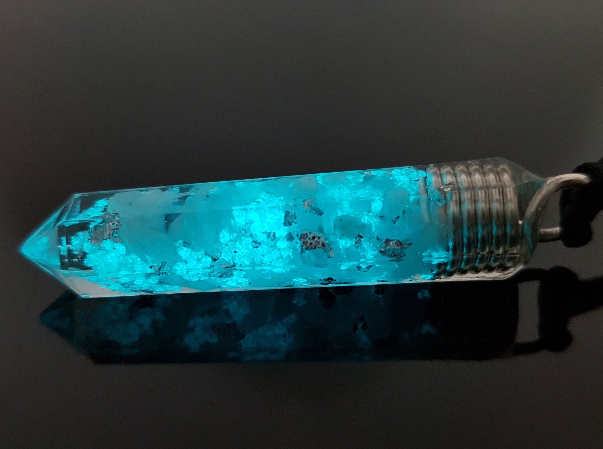 Aquamarine Orgone Orgonite pendant necklace, Reiki infused crystal chakra healing amulet, glow in dark
