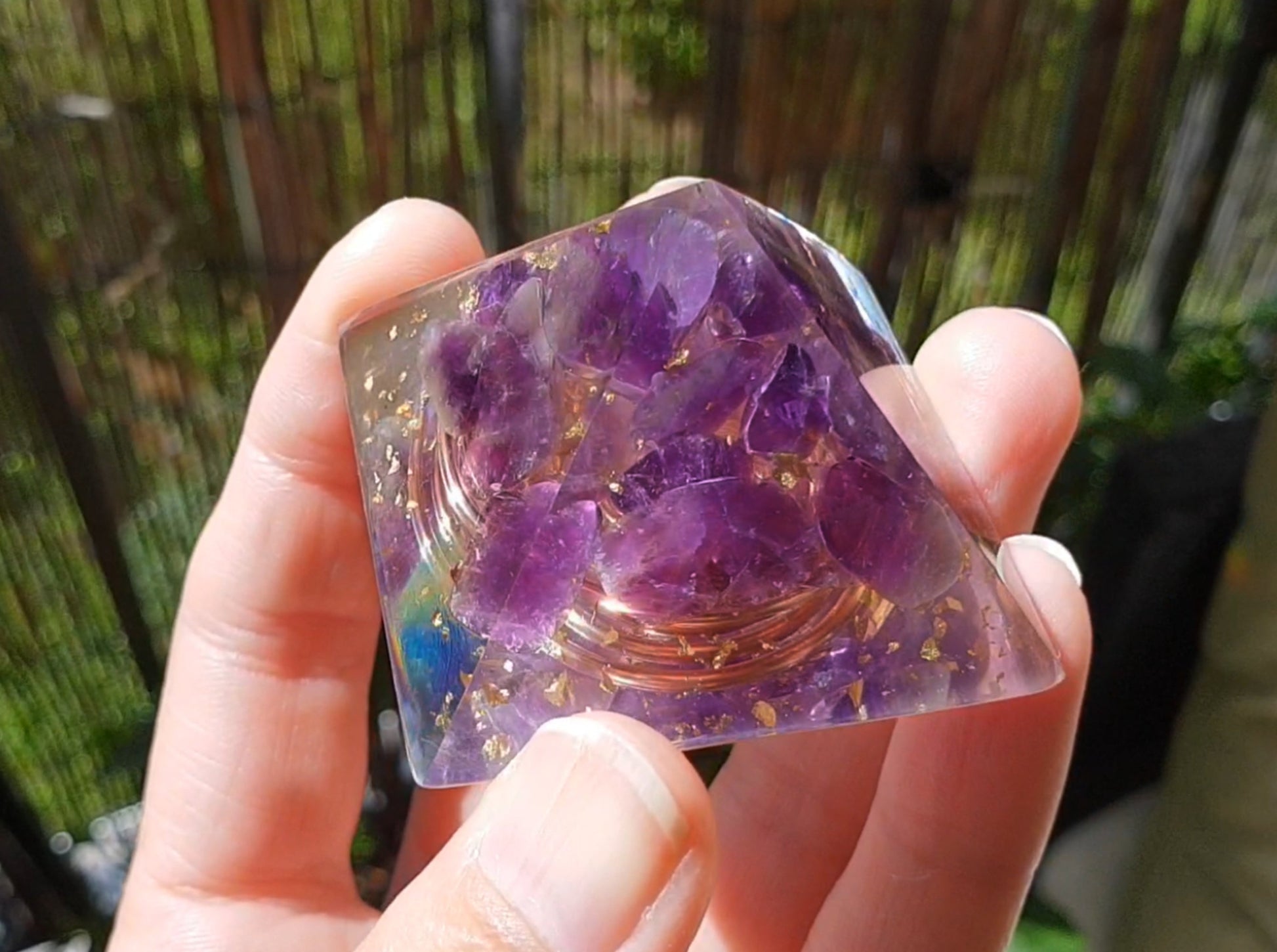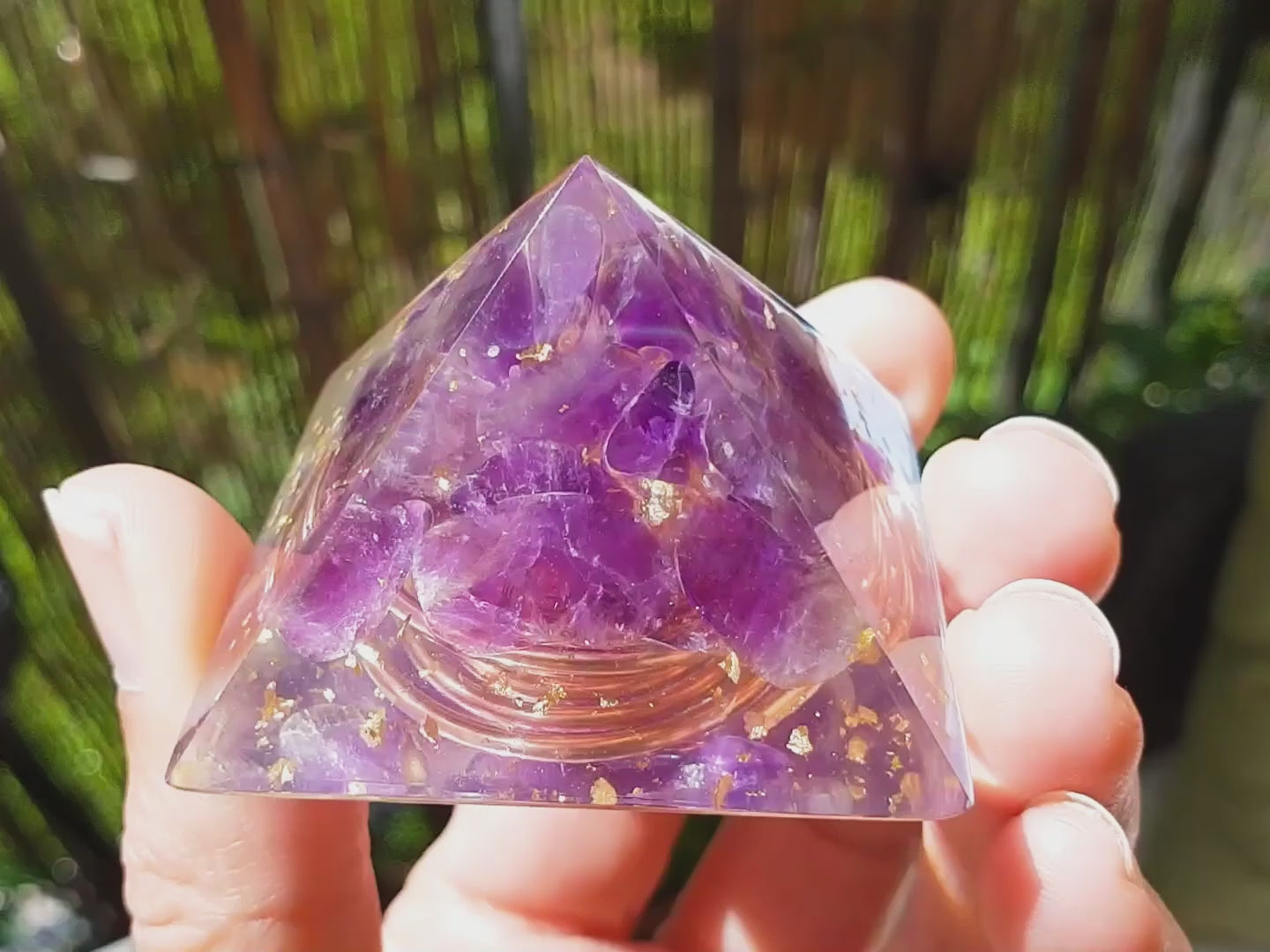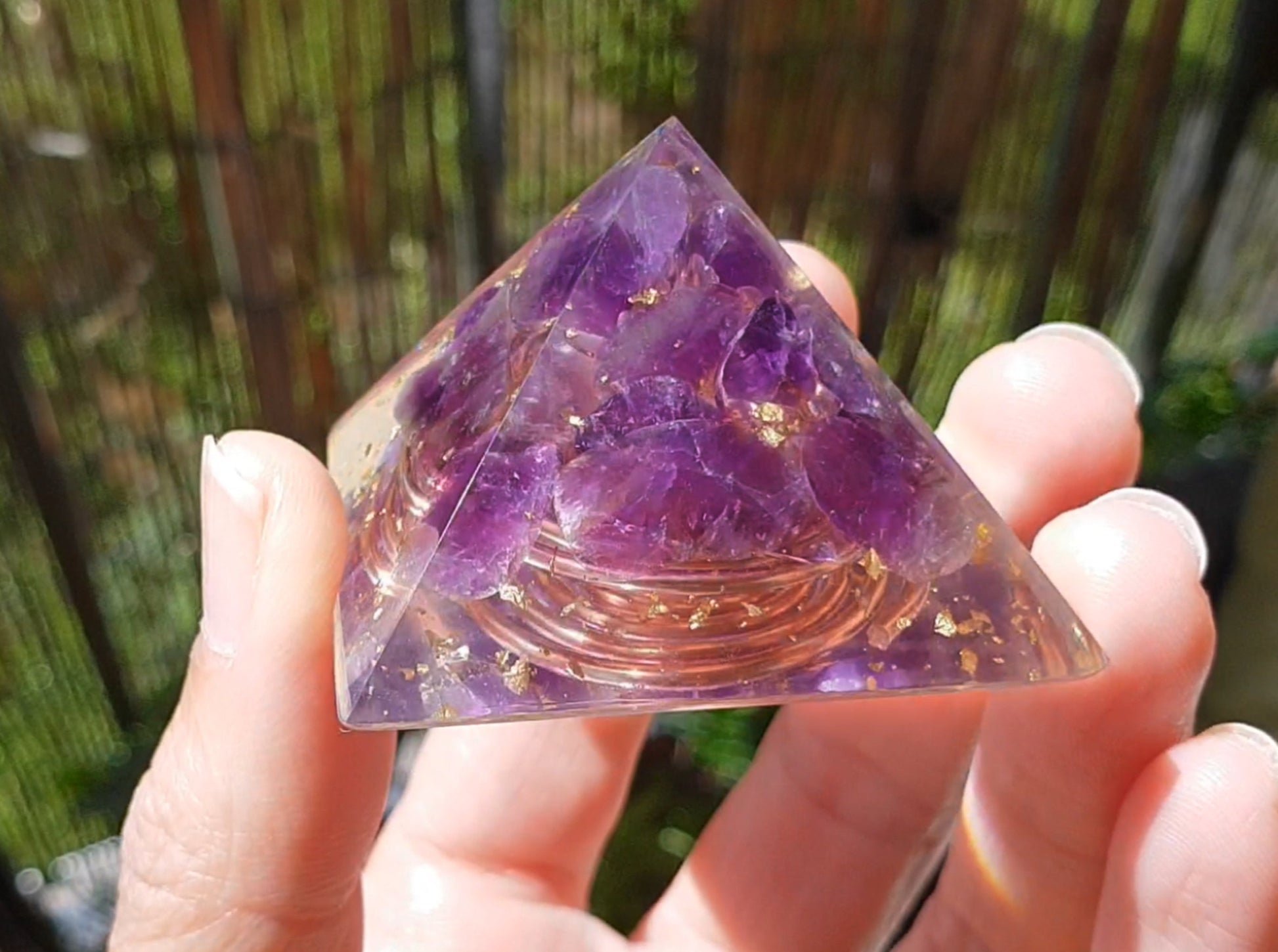 This orgonite pyramid, crafted with Amethyst and adorned with 24k gold, is a powerful symbol of spiritual protection and clarity. Amethyst is revered for its ability to purify the mind, enhance intuition, and promote spiritual growth. The addition of 24k gold amplifies these qualities, attracting abundance and prosperity while promoting a sense of inner peace and harmony. Together, they create a potent pyramid for enhancing meditation, calming the mind, and manifesting positive energy in your space. Perfect for those seeking spiritual enlightenment, emotional balance, and enhanced intuition.
