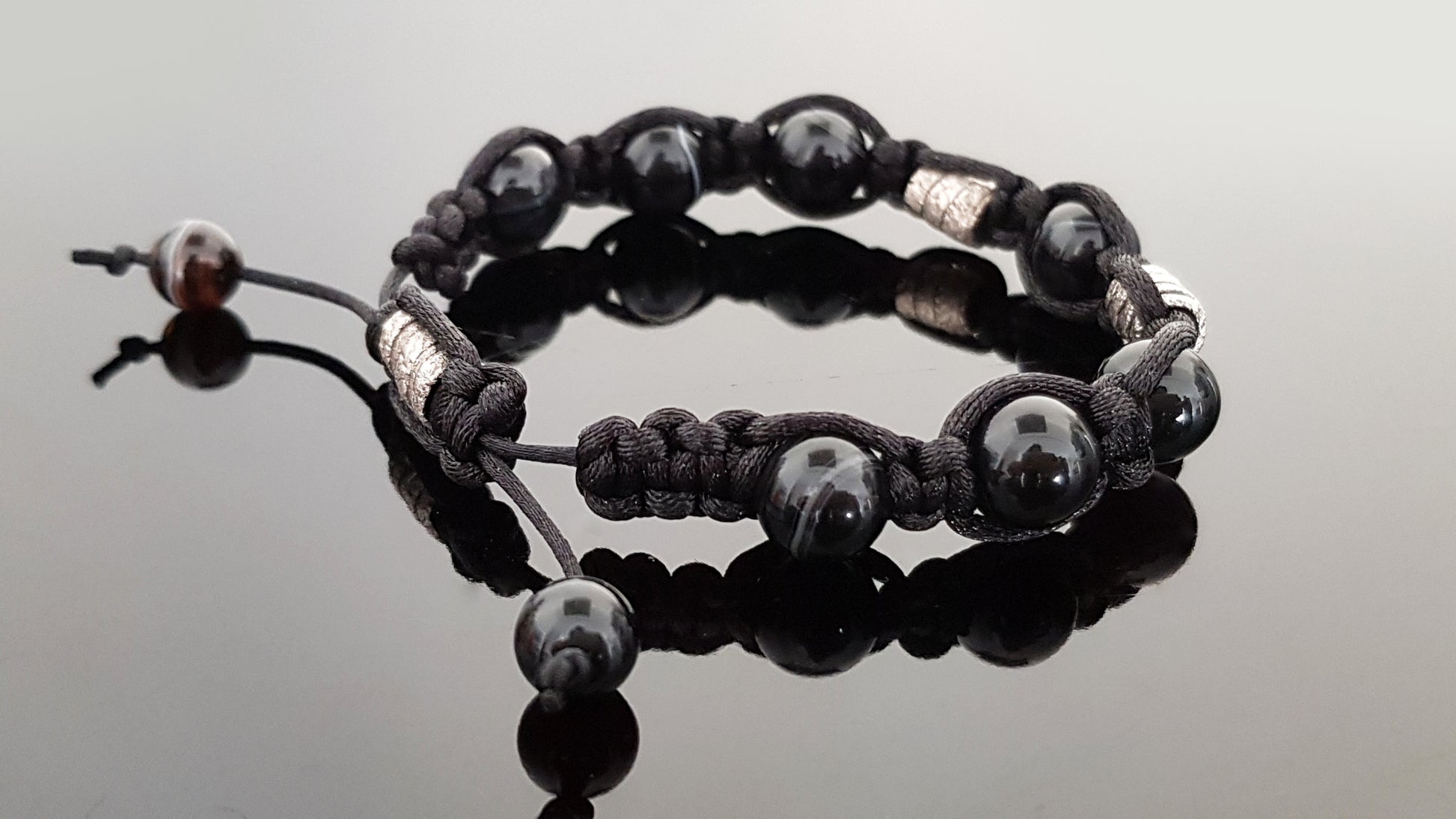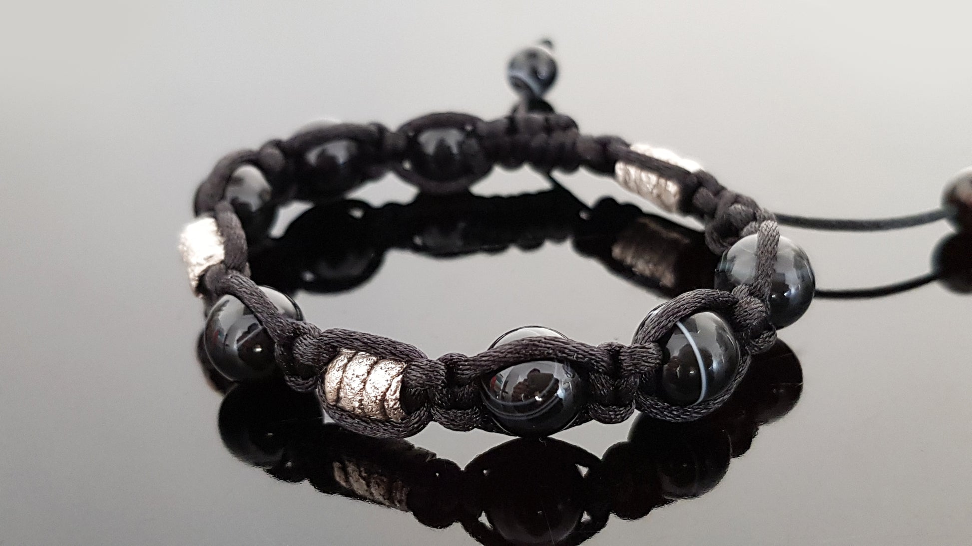 Shamballa bracelet, black agate onyx, 99.9 pure silver, programmed amulet charm