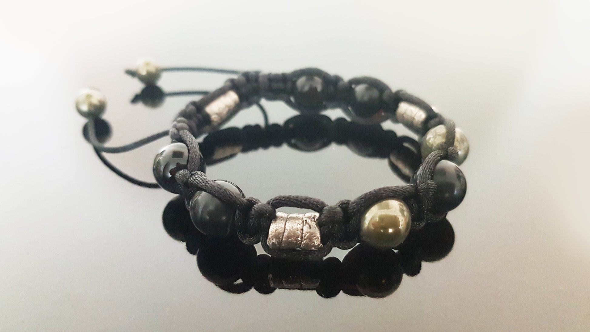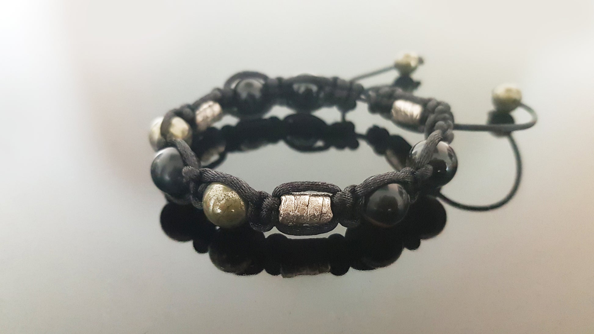 Shamballa bracelet, black agate onyx, pyrite, 99.9 pure silver beads, programmed amulet, charm
