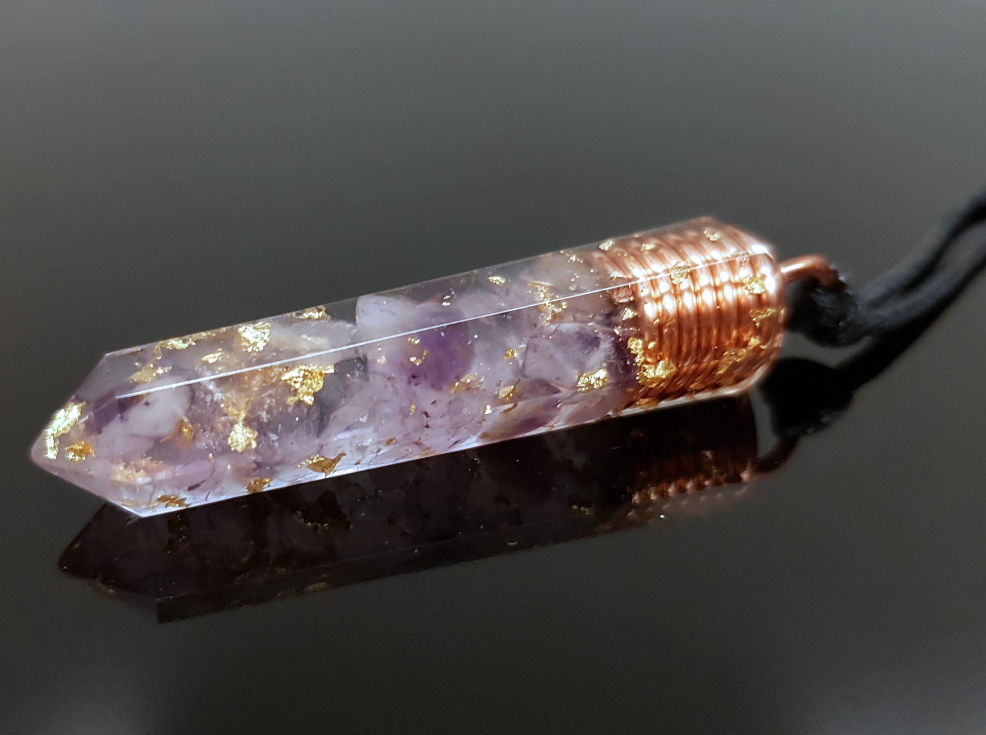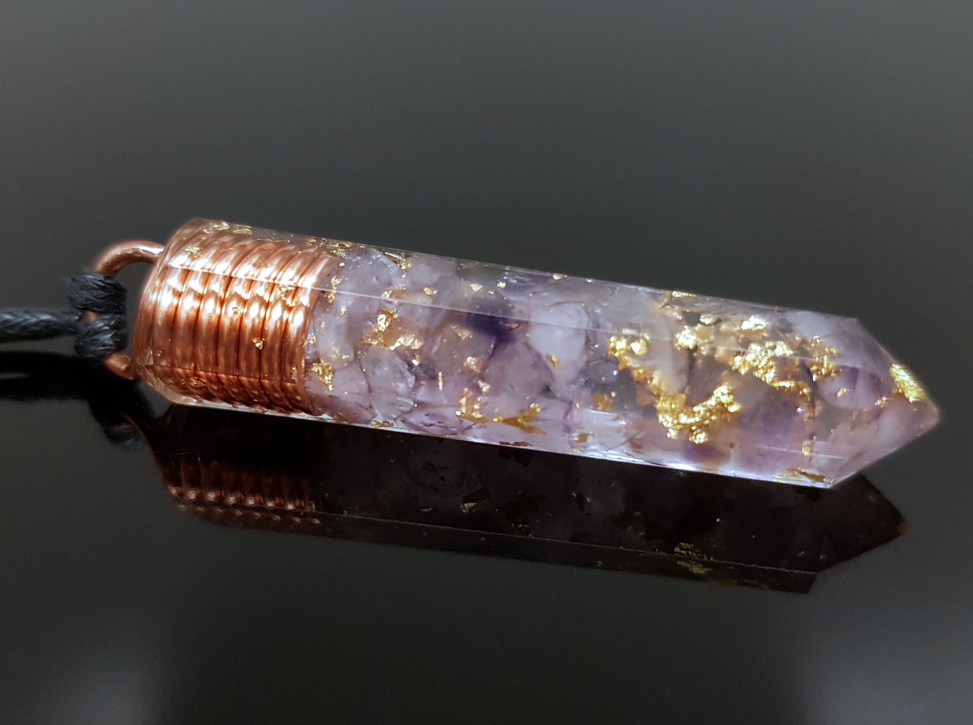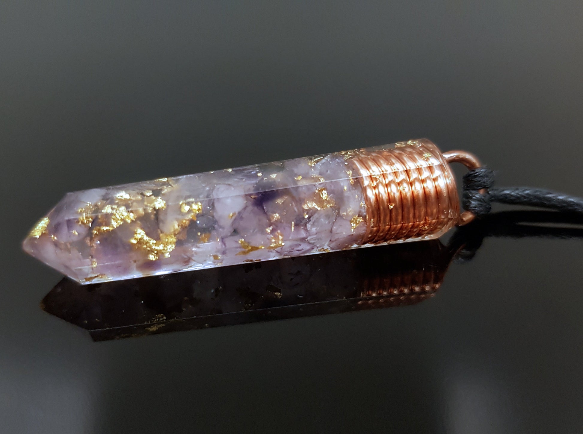 Amethyst Orgonite orgone pendant necklace. Reiki infused and charged amulet, 24k gold and copper. Powerful chakra healing, EMF protection, and high vibes. Strong third eye chakra stimulation.