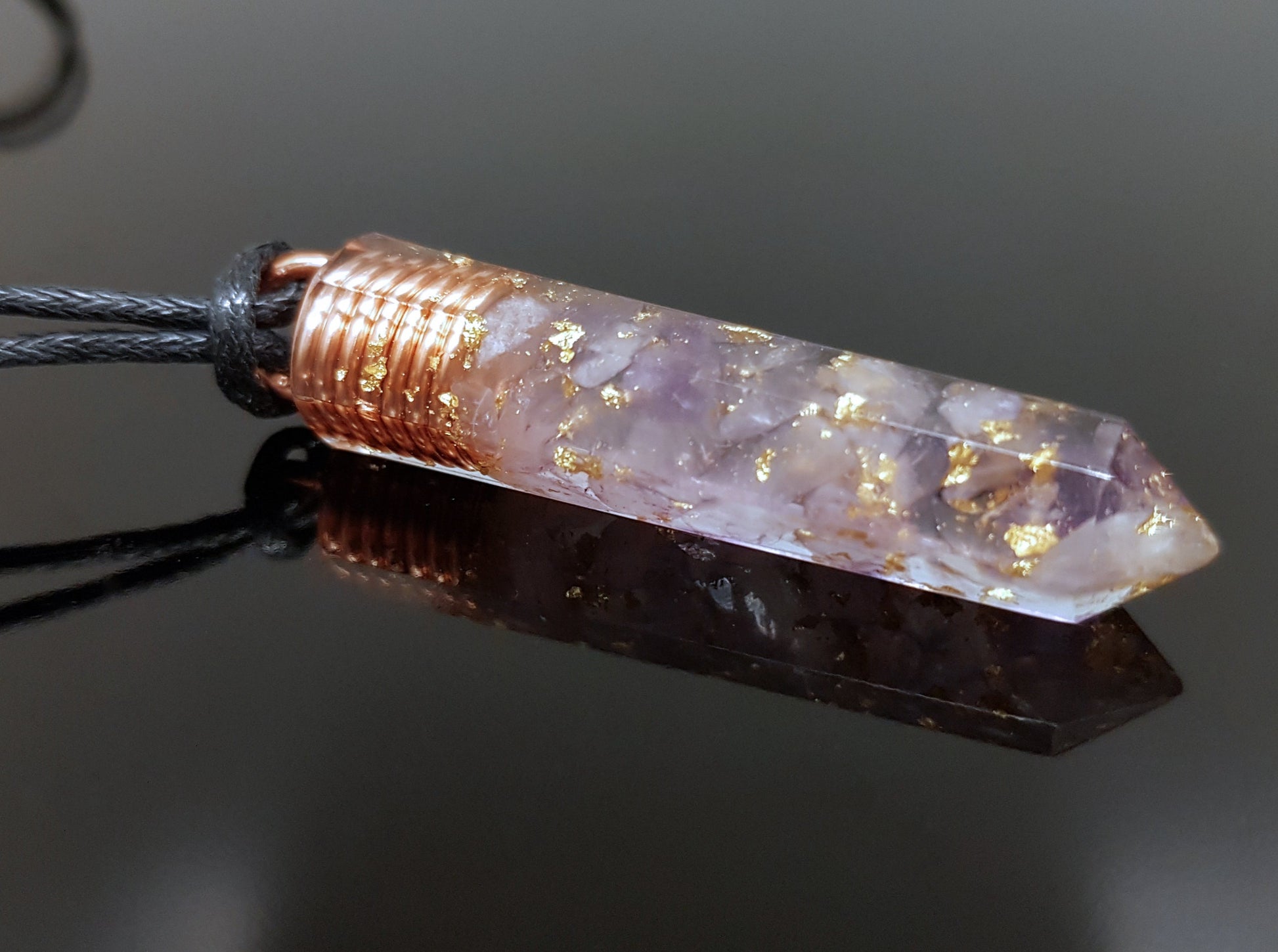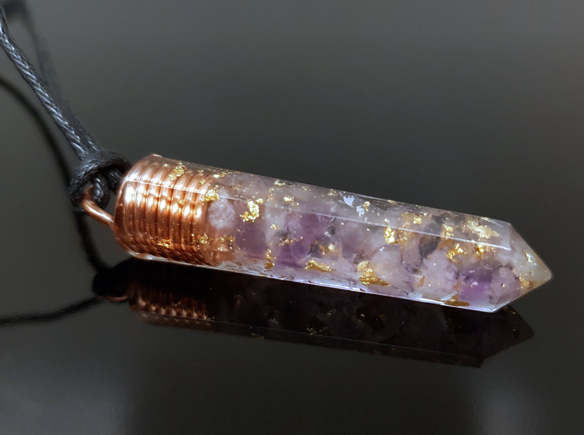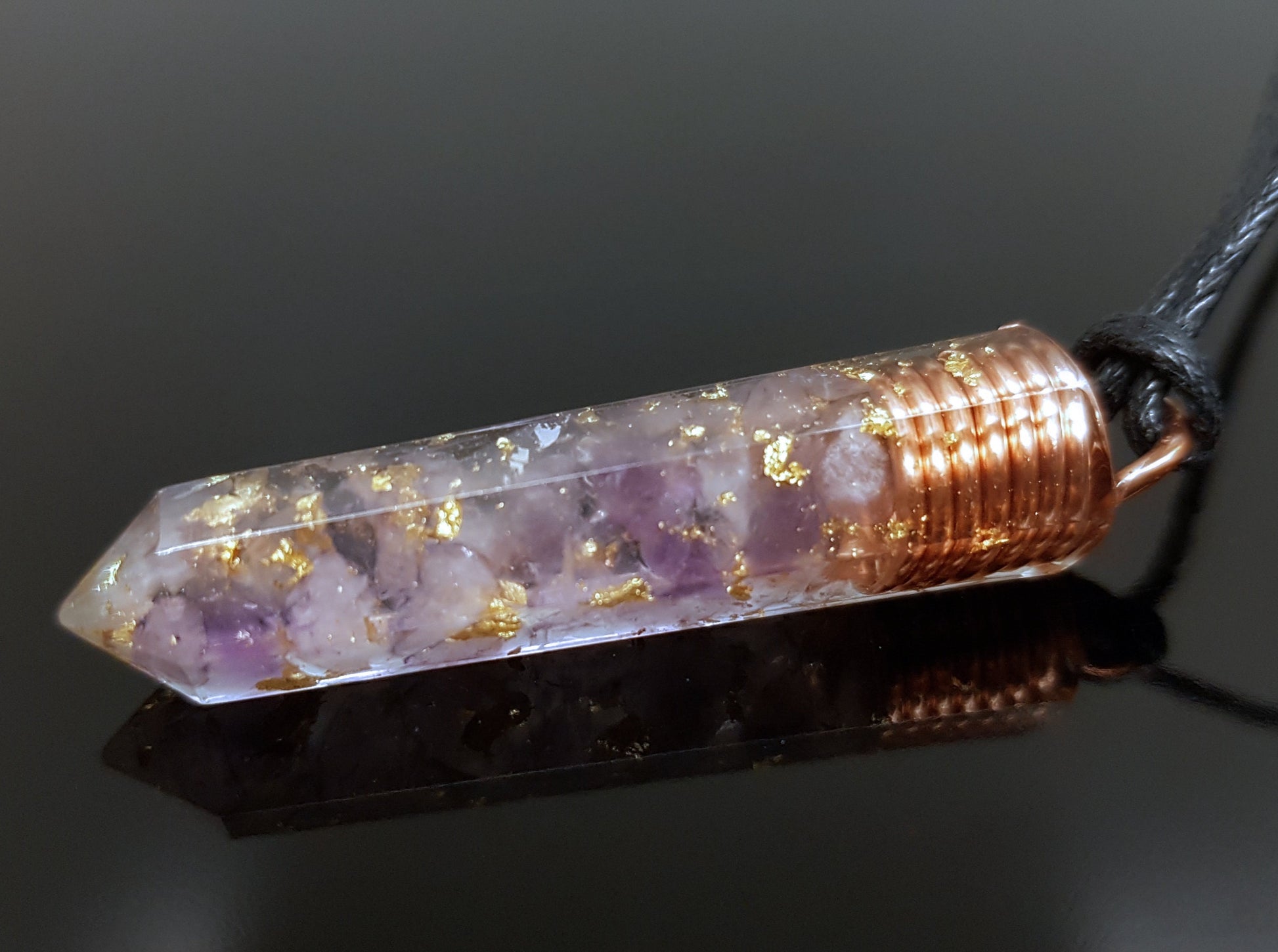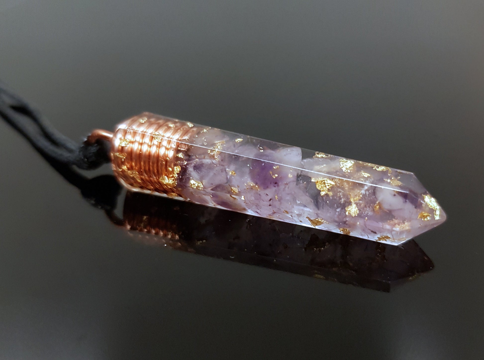 Amethyst Orgonite orgone pendant necklace. Reiki infused and charged amulet, 24k gold and copper. Powerful chakra healing, EMF protection, and high vibes. Strong third eye chakra stimulation.