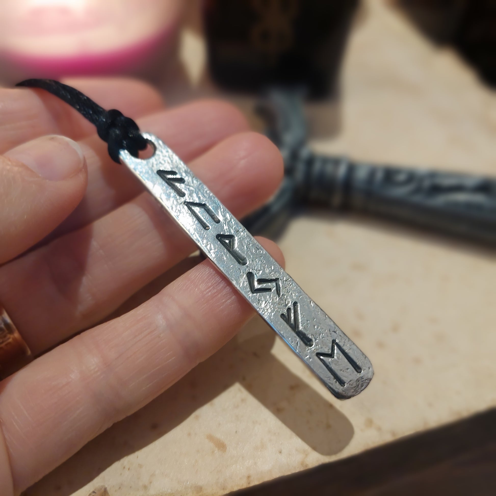 Luck Wealth money and Prosperity amulet pendant with runes formula. Silver rune amulet, Fehu. Roughly made, forged.