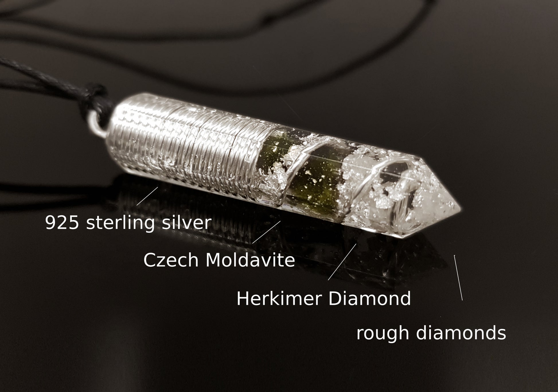 Powerful Orgone Necklace - Moldavite, Herkimer, and Diamonds. Programmed Reiki Pendant. Most powerful crystals combination in one orgonite pendant. Strong EMF protection. You can choose your programming preferences for this orgone necklace. This is a real amulet, an orgone necklace that will strongly influence your chosen area. You can choose these: spiritual growth, harmony, wealth and money, EMF protection, health, protection, or other specific areas/situation.