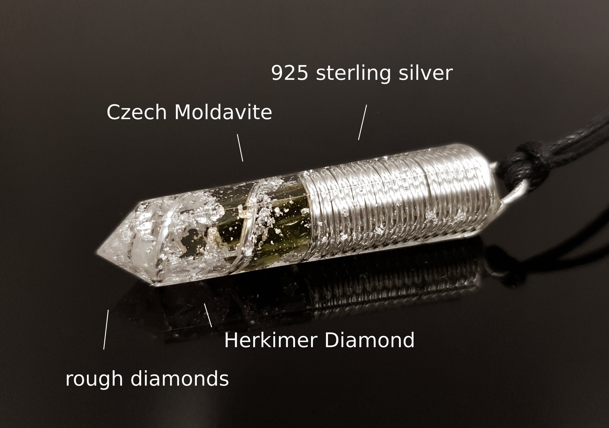 Crystals: 2-5 Rough Diamonds - 100% natural ( 0.5 ct together), 1 Naturally Faceted Herkimer Diamond Quartz from Middleville, New York, 1 natural Czech Moldavite from south-west Czech Republic.