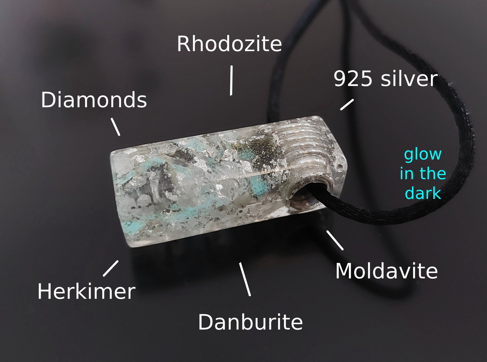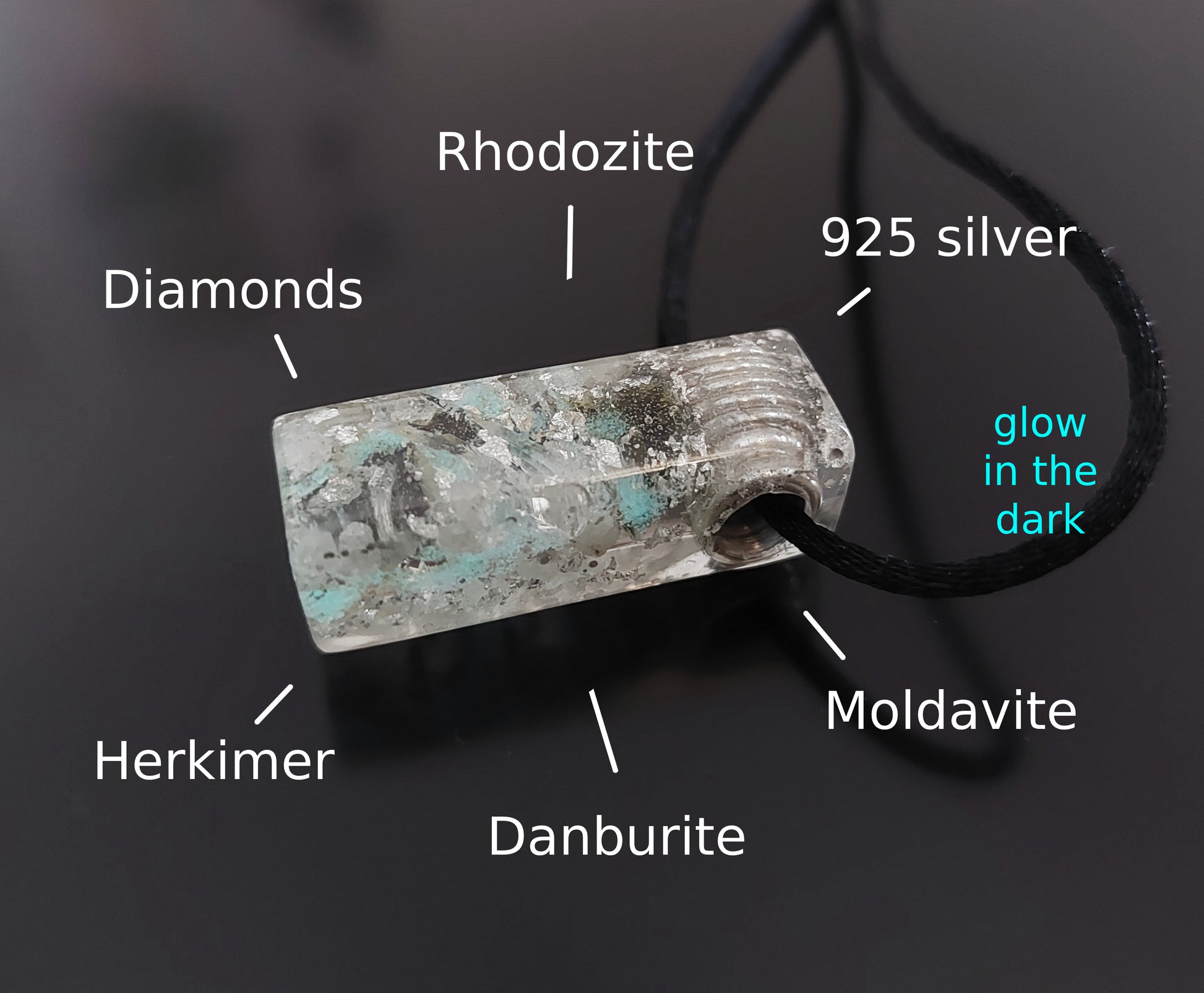 Powerful orgone pendant, orgonite necklace from very strong high vibration crystals and sterling silver. Diamonds, Moldavite, Herkimer, Rhodozite, Danburite, glow in the dark. This orgonite pendant will be a very powerful amulet that will raise the vibrations of its owner and stimulate the chakra system, especially the 3rd eye chakra and crown chakra. This is a great and powerful crystal combination to help manifest any of your chosen programs. I use a very powerful method of crystal programming based on my knowledge of alchemy and magic. A very strong combination for a very strong amulet that will last a lifetime and will not lose its strength as long as it exists.