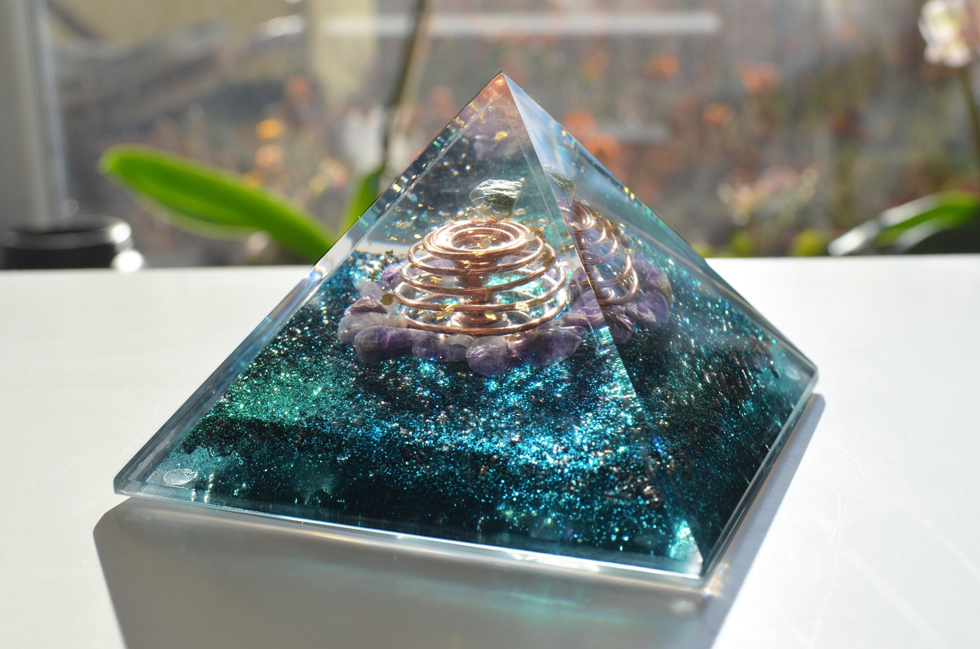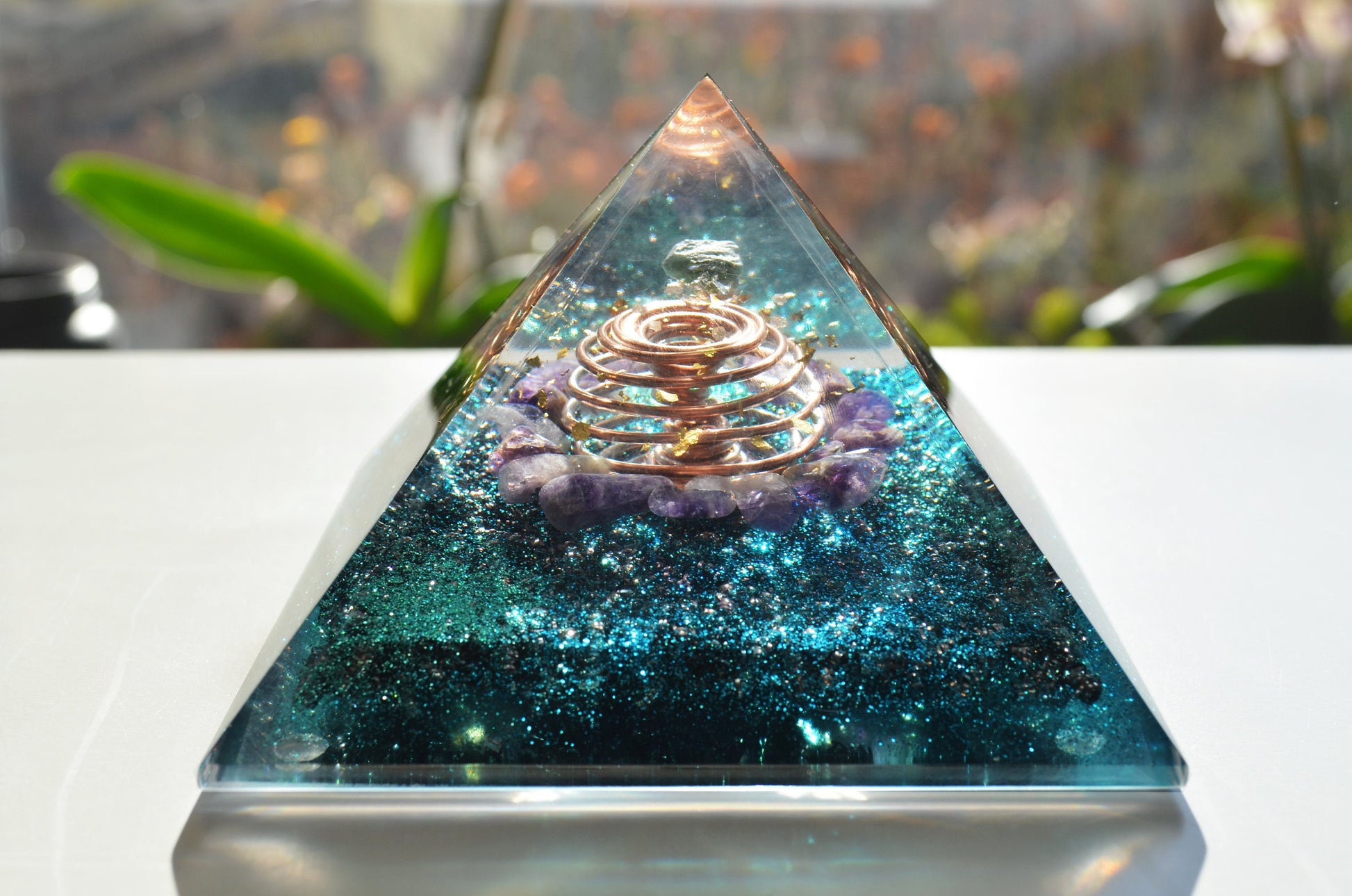 Most powerful third eye and crown chakra opening combination! Orgonite pyramid with Diamonds, Herkimer, Moldavite, Amethyst. This orgone energy pyramid contains the most powerful energetic combination that can be put into one orgone. It contains the most powerful crystals that can be found on Earth - Diamonds, Herkimer diamond and Czech Moldavite. All these crystals together produce very strong energy vibrations, which have a beneficial effect on many spheres of life - business, money, wealth, relationships, spiritual growth, etc.. I highly recommend this pyramid for third eye stimulation and spiritual growth, but it can also be programmed for other purposes.